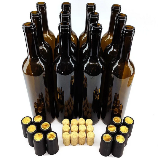 12 Pack 750mL Wine Bottles - Including Corks, Black Heat Shrink Sleeves & Hand Crafted Labels