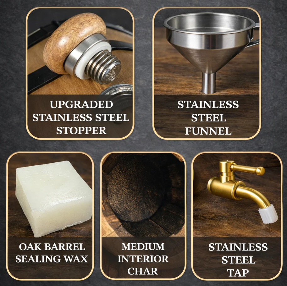 Introducing our exquisite 15L American Oak Barrel with a Medium Char, a must-have companion for spirits enthusiasts and craftsmen alike. Crafted from high-quality American oak, this barrel offers a unique and distinctive aging experience. The medium char level strikes a perfect balance, allowing for a gradual infusion of flavors and aromas. There are no liners or bladders like many other cheaper options on the market.These also boast superior 18-20mm thick oak staves, compared to many cheaper options on the market of around 10mm. This means your barrel will have less chance of leaking or leaching through the staves and also increase the longevity of your barrel and the flavours it will impart. This results in a smooth and sophisticated interaction between the oak and the stored liquid, creating a harmonious marriage of rich vanilla, caramel, and toasted notes. Whether you're aging your favourite port, whiskey, rum, or even experimenting with cocktails, our 15L American Oak Barrel with a Medium Char will enhance the maturation process, adding depth, complexity, and a touch of American craftsmanship to your creations. Embrace the art of aging with this exceptional barrel and unlock the true potential of your spirits.